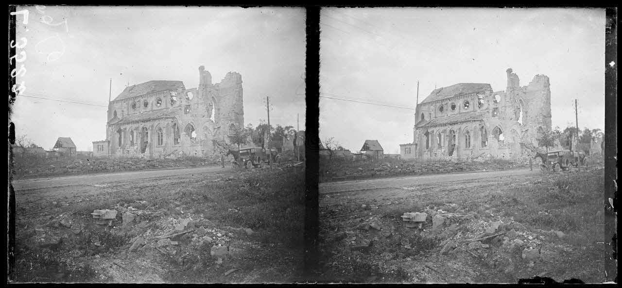 - à Ribécourt-Dreslincourt, des voitures de ravitaillement hippomobiles du 55e BCP (bataillon du chasseurs à pied) traversent le village en ruine (SPA 76 L 3521), les ruines de l'église (SPA 76 L 3522), des soldats français et des ambulances américaines (SPA 76 L 3523) ;