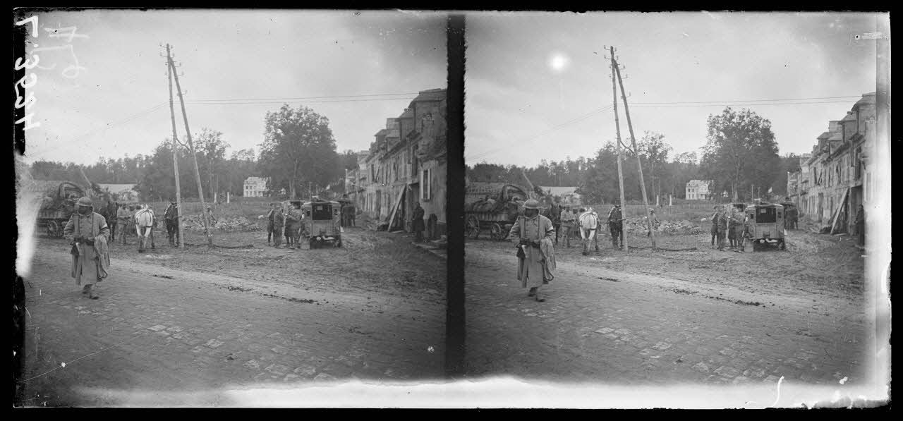 - à Ribécourt-Dreslincourt, des voitures de ravitaillement hippomobiles du 55e BCP (bataillon du chasseurs à pied) traversent le village en ruine (SPA 76 L 3521), les ruines de l'église (SPA 76 L 3522), des soldats français et des ambulances américaines (SPA 76 L 3523) ;