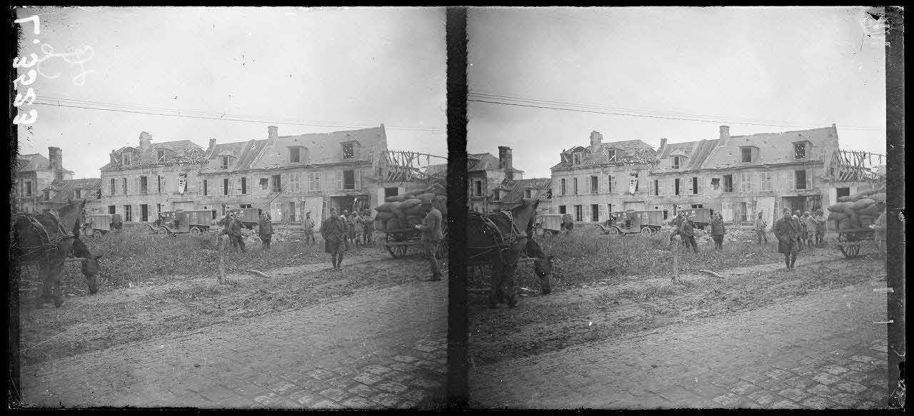 - à Ribécourt-Dreslincourt, des voitures de ravitaillement hippomobiles du 55e BCP (bataillon du chasseurs à pied) traversent le village en ruine (SPA 76 L 3521), les ruines de l'église (SPA 76 L 3522), des soldats français et des ambulances américaines (SPA 76 L 3523) ;