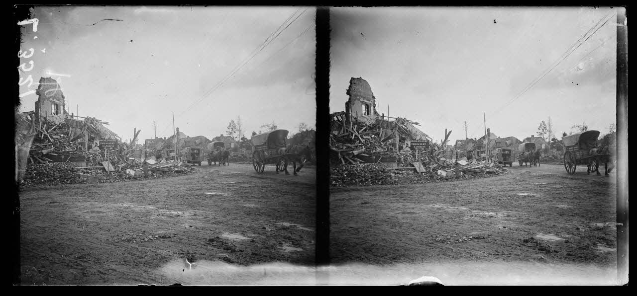 - à Ribécourt-Dreslincourt, des voitures de ravitaillement hippomobiles du 55e BCP (bataillon du chasseurs à pied) traversent le village en ruine (SPA 76 L 3521), les ruines de l'église (SPA 76 L 3522), des soldats français et des ambulances américaines (SPA 76 L 3523) ;