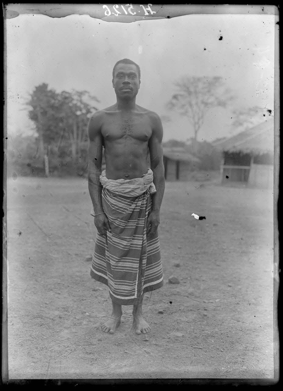 Portrait en pied d'un homme de l'ethnie Batéké, habitant les rives du Ntem, ou rio Campo.