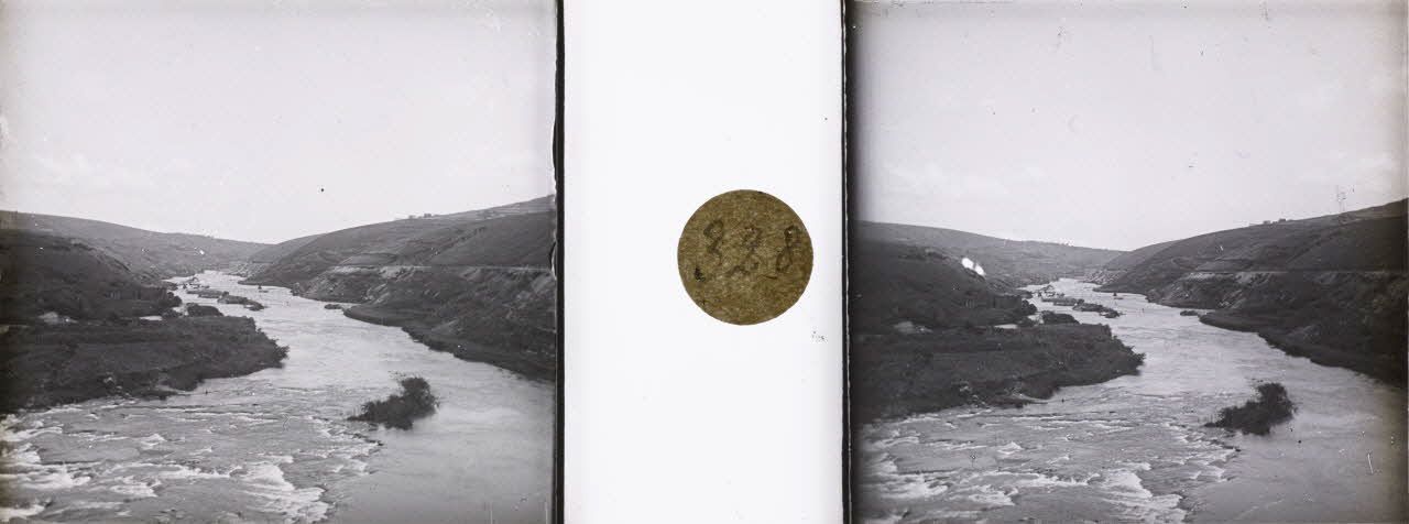 D68-32. René Denis photographie les paysages naturels malgaches lors de ses expéditions cartographiques dans la vallée de la Mandraka à l'est de Manjakandriana. Il circule alors avec deux tirailleurs et deux équipes de quatre bourjanes. Il photographie également le barrage d'Antelomito et son usine hydro-électrique.