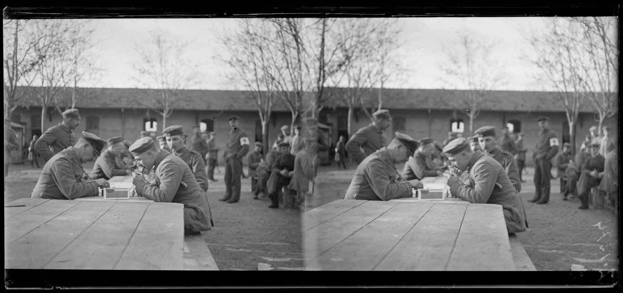 Barcelonnette (Alpes de Haute Provence, 25/12/1915, Z 1143 à Z 1150) le jour de Noël, le dépôt des prisonniers de guerre allemands. (Z 1161 à Z 1162), Noël au dépôt de prisonniers ; l'opérateur signale sur sa fiche que la caserne de Barcelonnette est "du dernier modèle, tout le confort moderne, chauffage central, salle de bains etc. etc.".