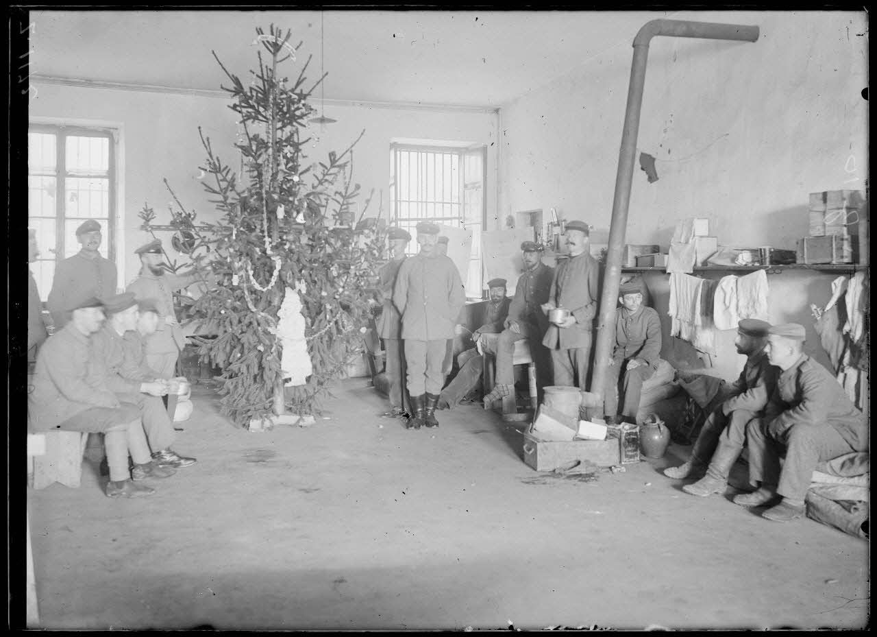 Barcelonnette (Alpes de Haute Provence, 25/12/1915, Z 1143 à Z 1150) le jour de Noël, le dépôt des prisonniers de guerre allemands. (Z 1161 à Z 1162), Noël au dépôt de prisonniers ; l'opérateur signale sur sa fiche que la caserne de Barcelonnette est "du dernier modèle, tout le confort moderne, chauffage central, salle de bains etc. etc.".