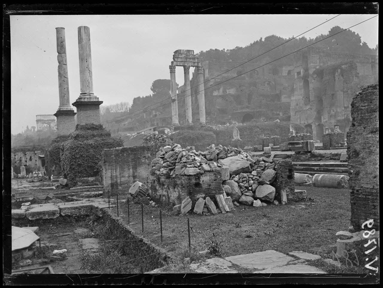 Vue du forum avec le temple de Castor et Pollux et l'arc de Titus au fond.