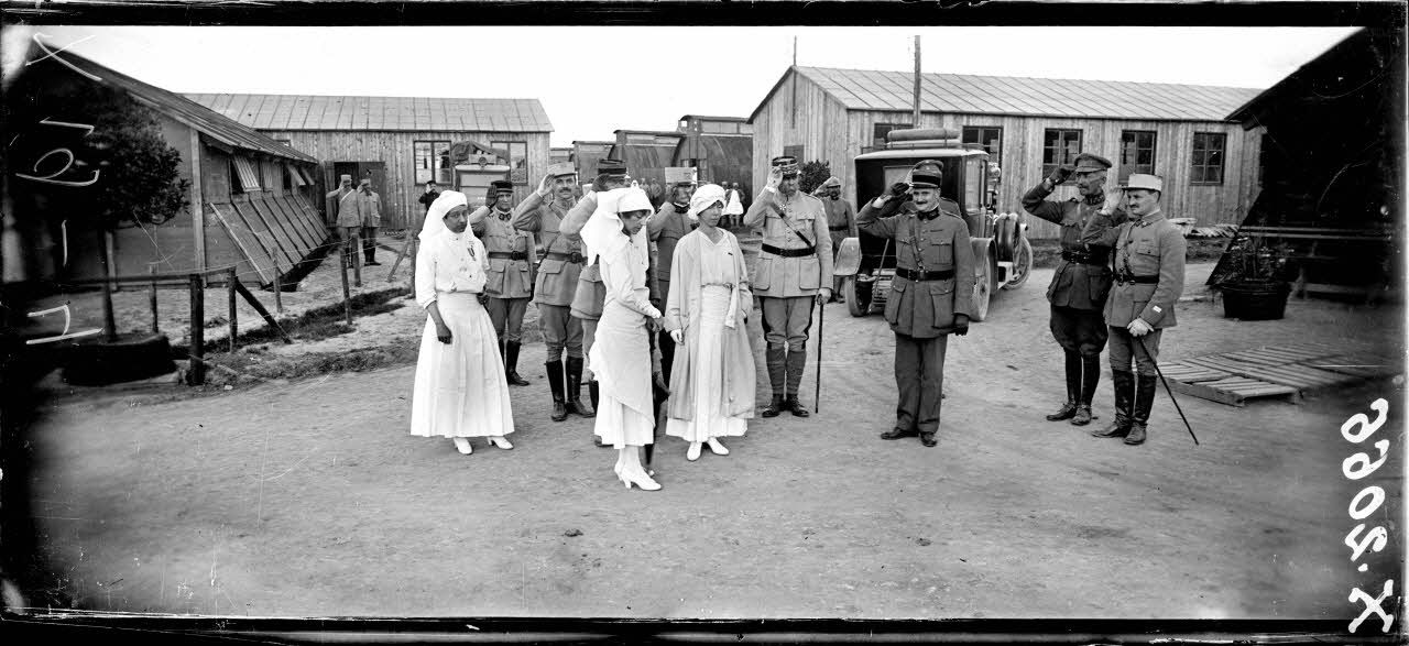 - des visites du roi et de la reine des Belges au camp d'aviation de Bergues, au QG de la 1re armée à Rexpoëde où ils décorent le capitaine Guynemer et à l'hôpital chirurgical de Rousbrugge. Ce dernier groupe de photographies permet de voir le personnel médical français et américain ainsi que les installations médicales ;