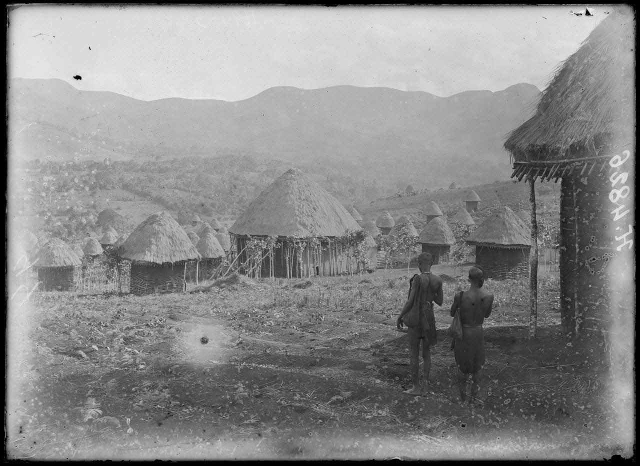 De la partie supérieure du village Grassfield de Bangou, deux indigène regardent les habitations qui s'étagent en dessous d'une grande place.