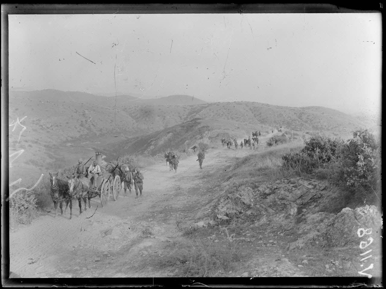 Sur la route de Doiran qui mène de la base de Salonique aux premières lignes, des convois de ravitaillement circulent. Des obus bulgares ont éclaté près de la gare et du chemin de fer.
