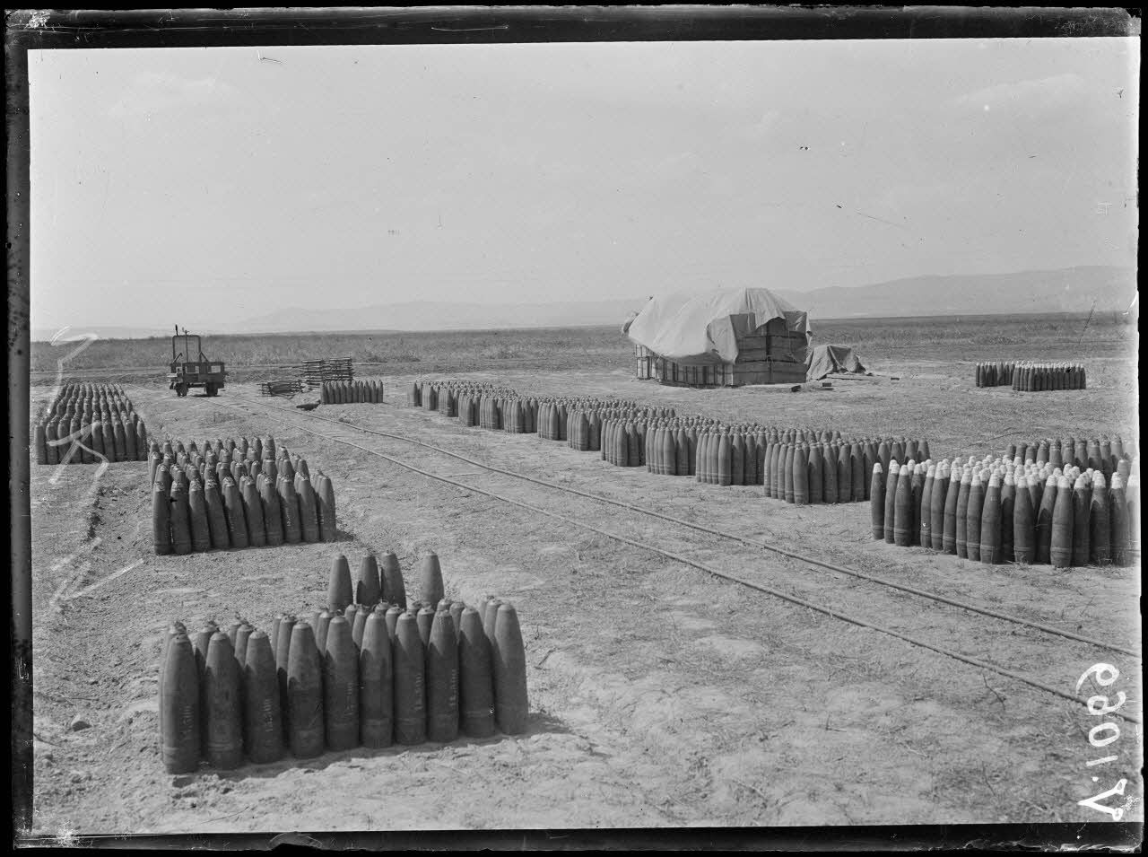 Route de Doiran. Parc d'obus près de la ligne du chemin de fer. [légende d'origine]