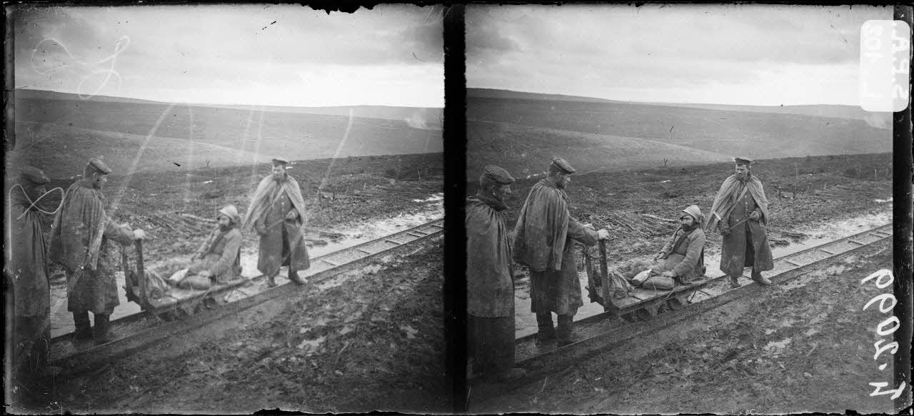 - sur la route entre Verdun et Douaumont : la gare de ravitaillement de Adelbert à 500 m du fort de Douaumont, le transport d'un blessé venant des premières lignes, un cantonnement dans le ravin des Vignes (SPA 42 L 2061/2062/2072), l'entrée des abris de l'ouvrage d'Adelbert (SPA 42 L2079), les défenses de barbelés du PC " MF4 " près de Fleury, le poste d'abri des 4 Cheminées, l'entrée de l'ouvrage de l'abri des 4 Cheminées, un blessé français ramené par des prisonniers allemands sur un wagonnet Decauville, un cadavre français (SPA 42 L 2071/2075),la bifurcation des pistes entre Douaumont et Adelbert (SPA 42 L 2080/2081) ;