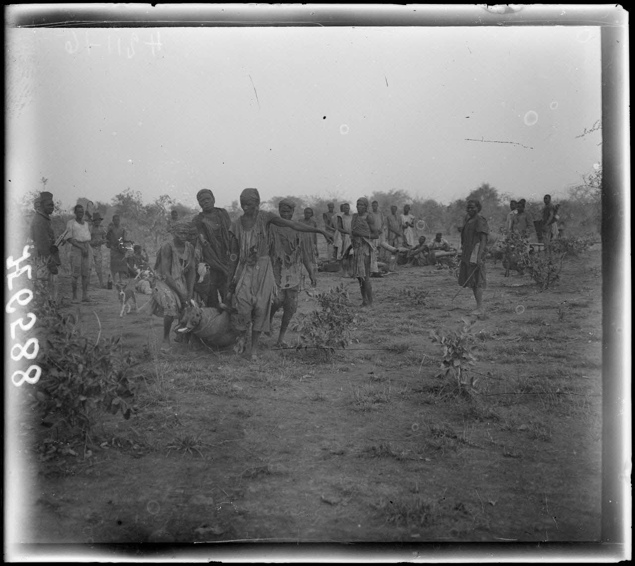 Aux environs de Guider et du mayo Larba, les porteurs du convoi de la mission photographique ont capturé un phacochère. Quatre hommes le transportent dans une toile.