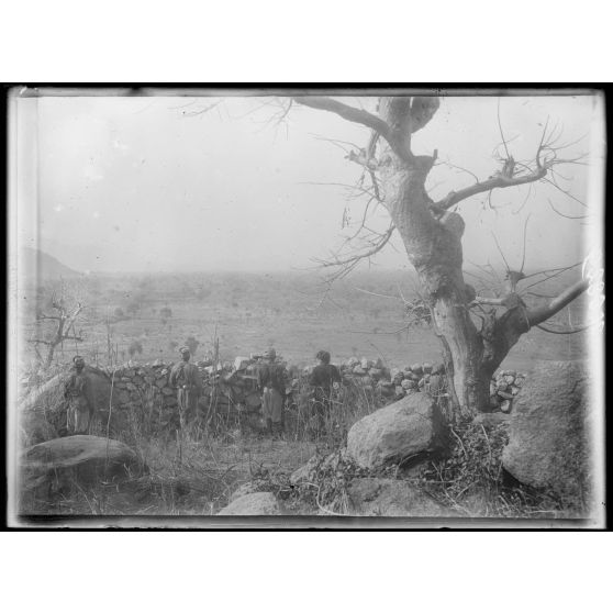 Note : (1) La légende figurant sur la fiche manuscrite de l'opérateur était "Position française de Sava, vue sur la plaine vers le nord", ce qui n'est pas le cas de ce cliché montrant un piton rocheux. La légende de la plaque H 1826 correspond plus à cette vue.