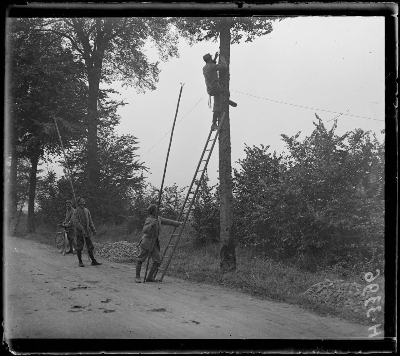 Route de Montdidier à Amiens. Fixation du cable sur arbre. [légende d'origine]