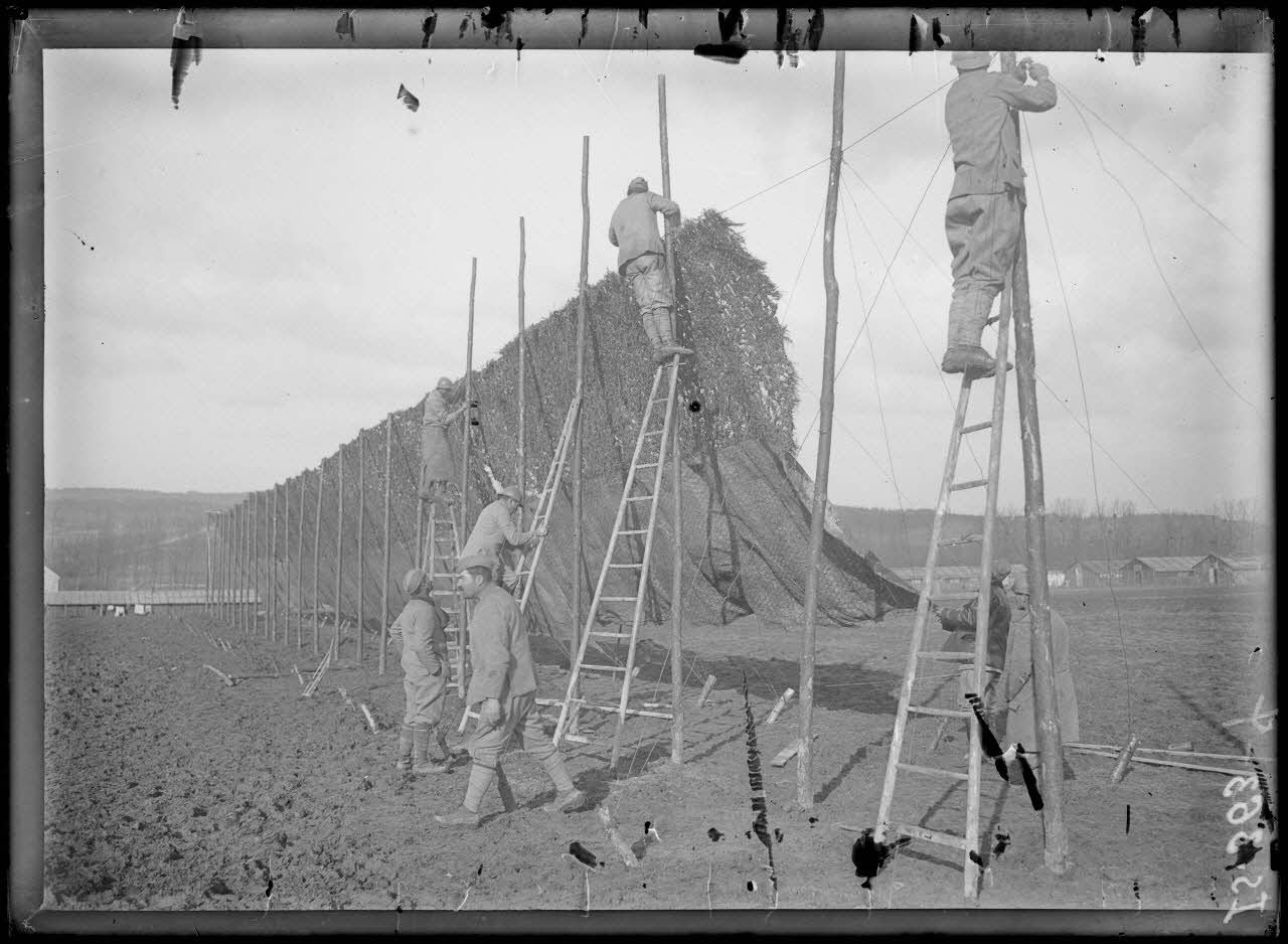 - Sur la route reliant Muizon à Reims (IS 362 à IS 363) un filet de camouflage est posé sur une route. Chantier de matériaux de guerre, les prisonniers allemands déchargent le matériel.