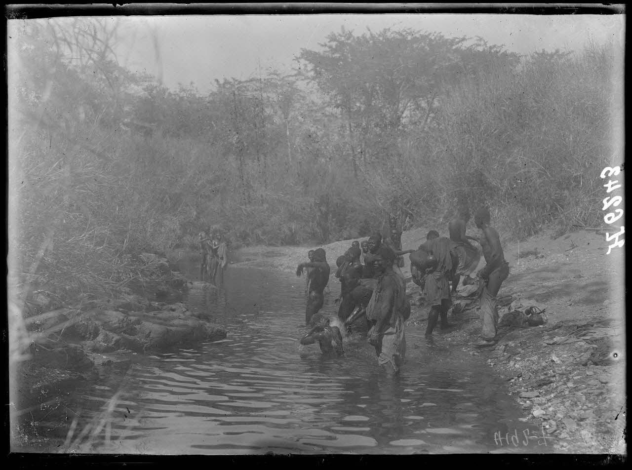 Route de N'Gaoundéré à Garoua. Porteurs se lavant dans le mayo Matoléro. [légende d'origine]
