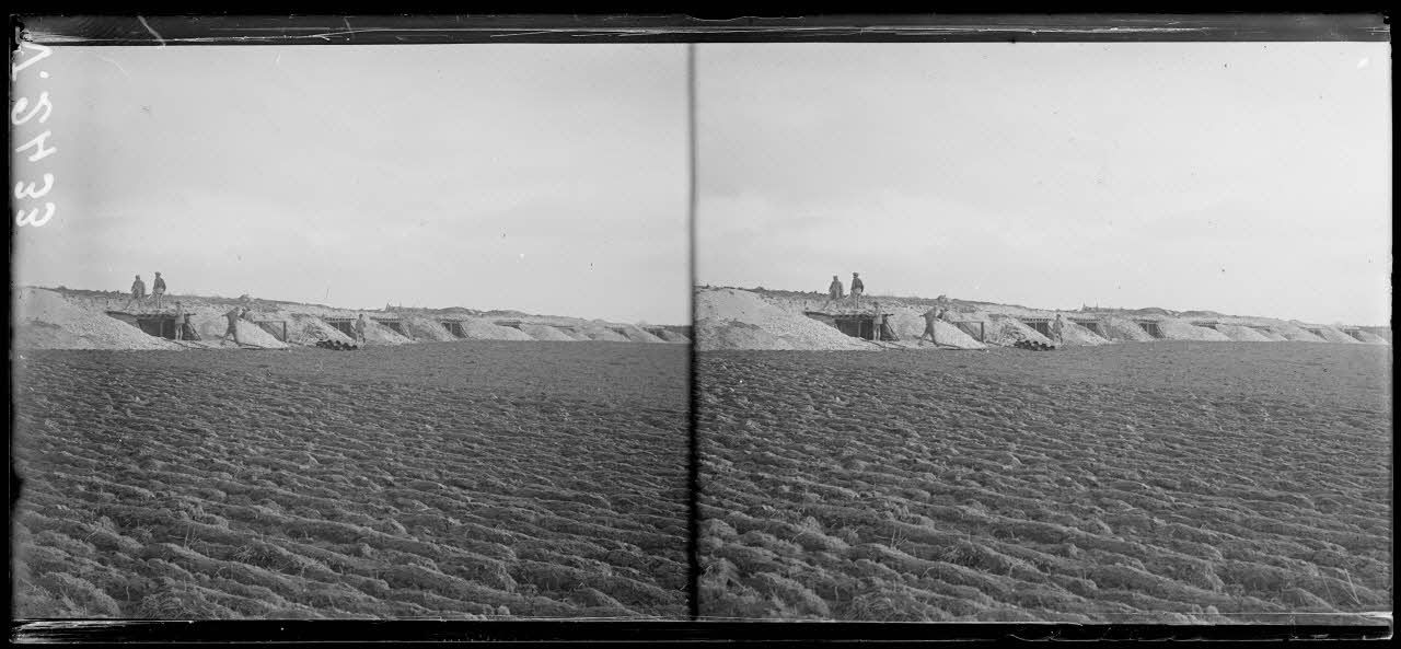 - Dans la zone ouest de Reims, près de Champigny (Marne, 30/01/1918, V 2401 à V 2403), des soldats creusent des tranchées le long de la route qui relie Champigny à Reims.