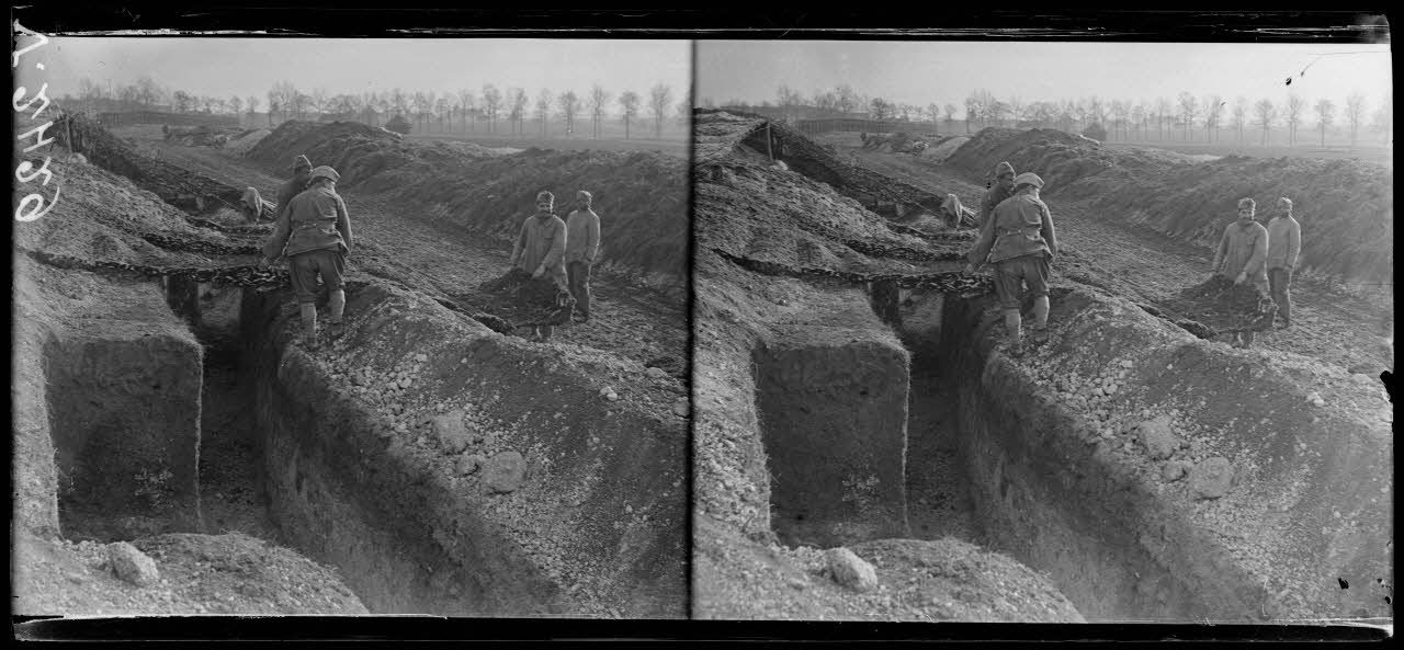 - Dans la zone ouest de Reims, près de Champigny (Marne, 30/01/1918, V 2401 à V 2403), des soldats creusent des tranchées le long de la route qui relie Champigny à Reims.