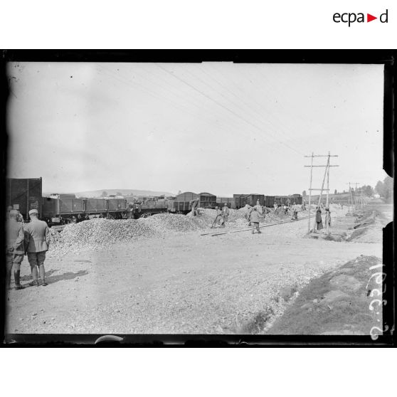 Bazoches (Aisne). Dépôt de matériel du génie à la gare ; déchargement d'un train de cailloux.