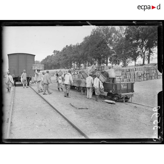A la gare de Bazoches-sur-Vesles, un train de cailloux et un wagon transportant du sable sont déchargés près du magasin du génie. Des munitions, dont des obus de 75 mm, sont déchargés et entreposés dans le dépôt de munitions de la gare. Les caisses de munitions sont recouvertes par des sacs de sable pour les protéger des bombardements.