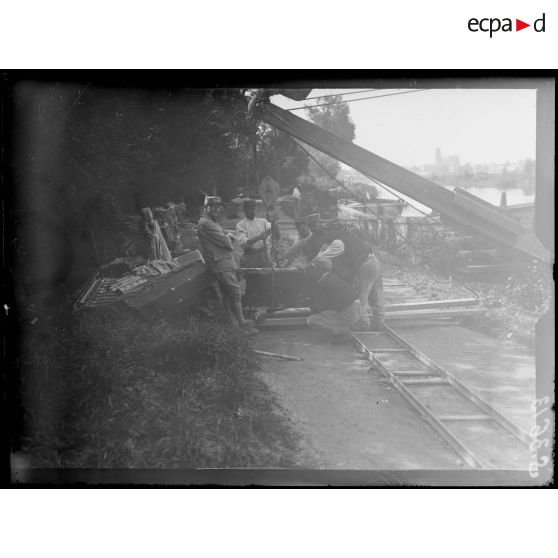 Soissons. Travaux de construction du pont sur l'Aisne. Déchargement de pierres.