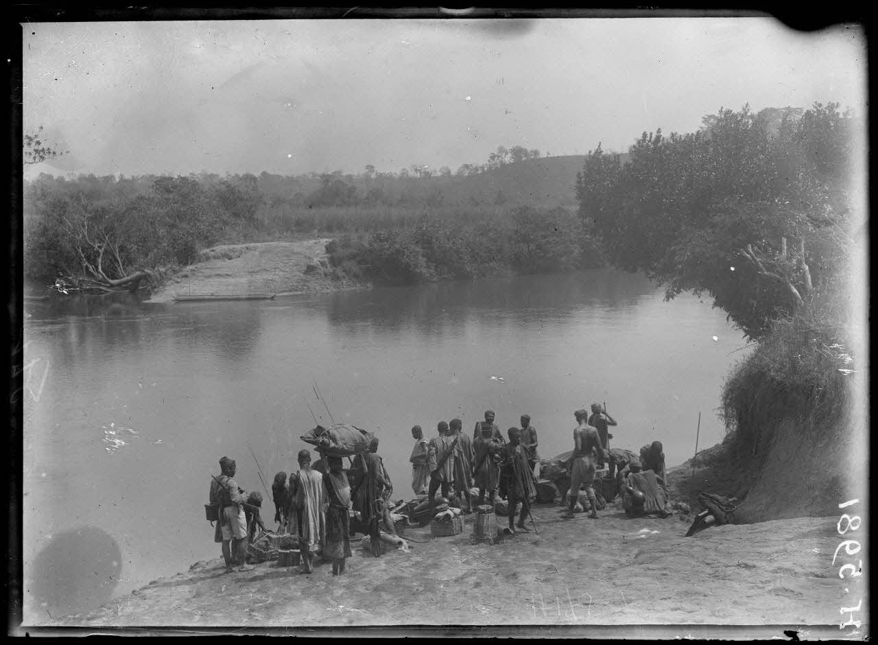 Le convoi de la mission photographique commence son voyage vers le nord et la province de l'Adamaoua. Au nord de Tibati, après avoir traversé le Meng, il faut franchir le Maour. Les porteurs attendent sur la berge du fleuve.