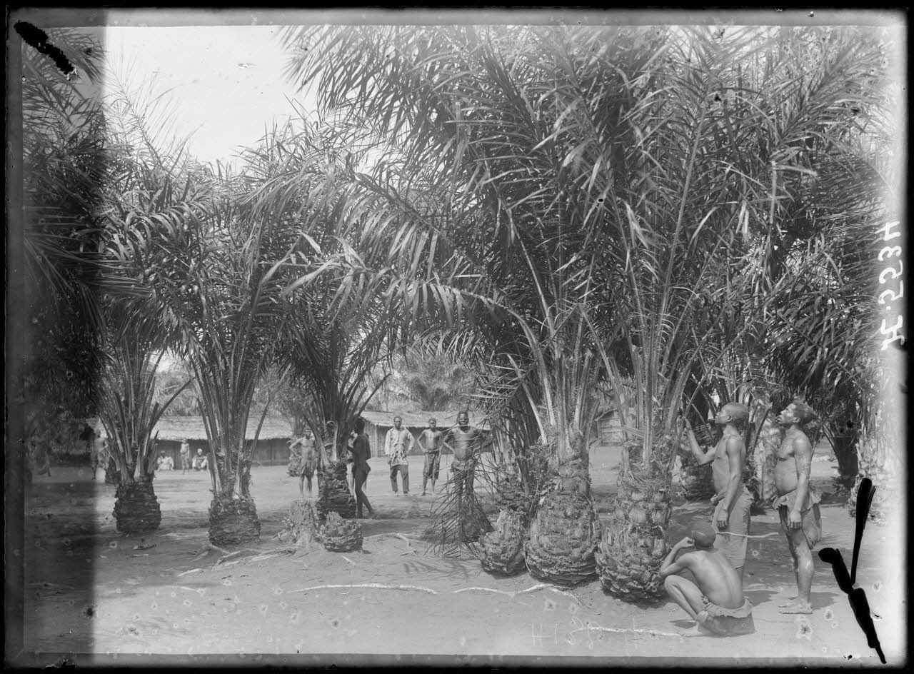 Route de Yaoundé à Yoko. N'Koumétou. Palmiers à huile sur la route. [légende d'origine]