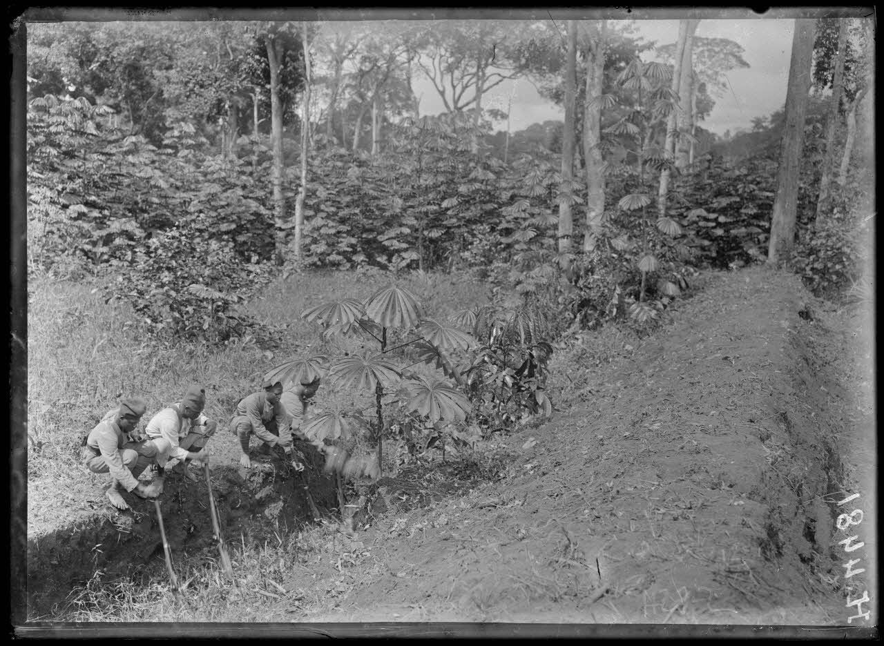 Route de Yaoundé, kilomètre 45. Lengoé. Talus et tranchée garnie de pieux pointus (où sont les tirailleurs) orientée face au sud. [légende d'origine]