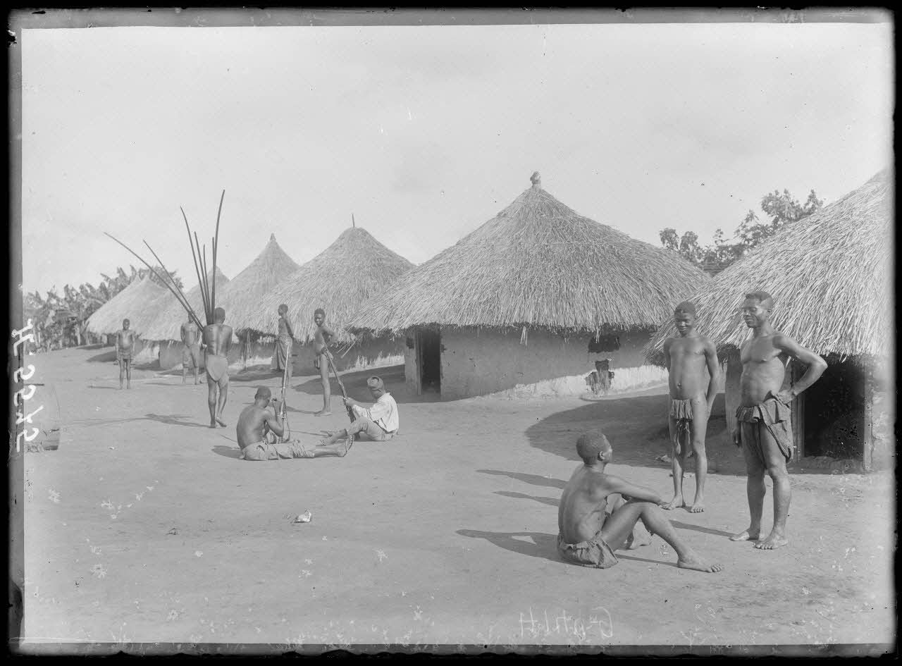 Deux tirailleurs sont assis dans la rue du village de Nguila, devant les cases des indigènes vivant à côté de la mission allemande.