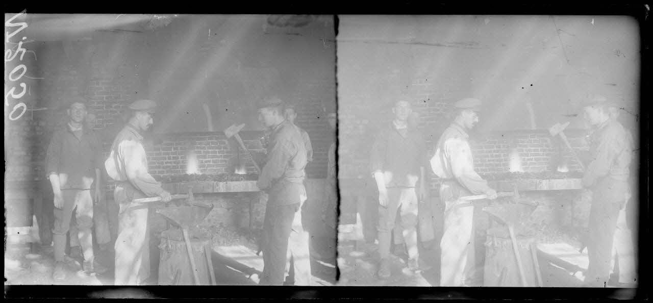 Roye (Somme). Prisonniers allemands travaillant à la reconstruction. Les forgerons. [légende d'origine]