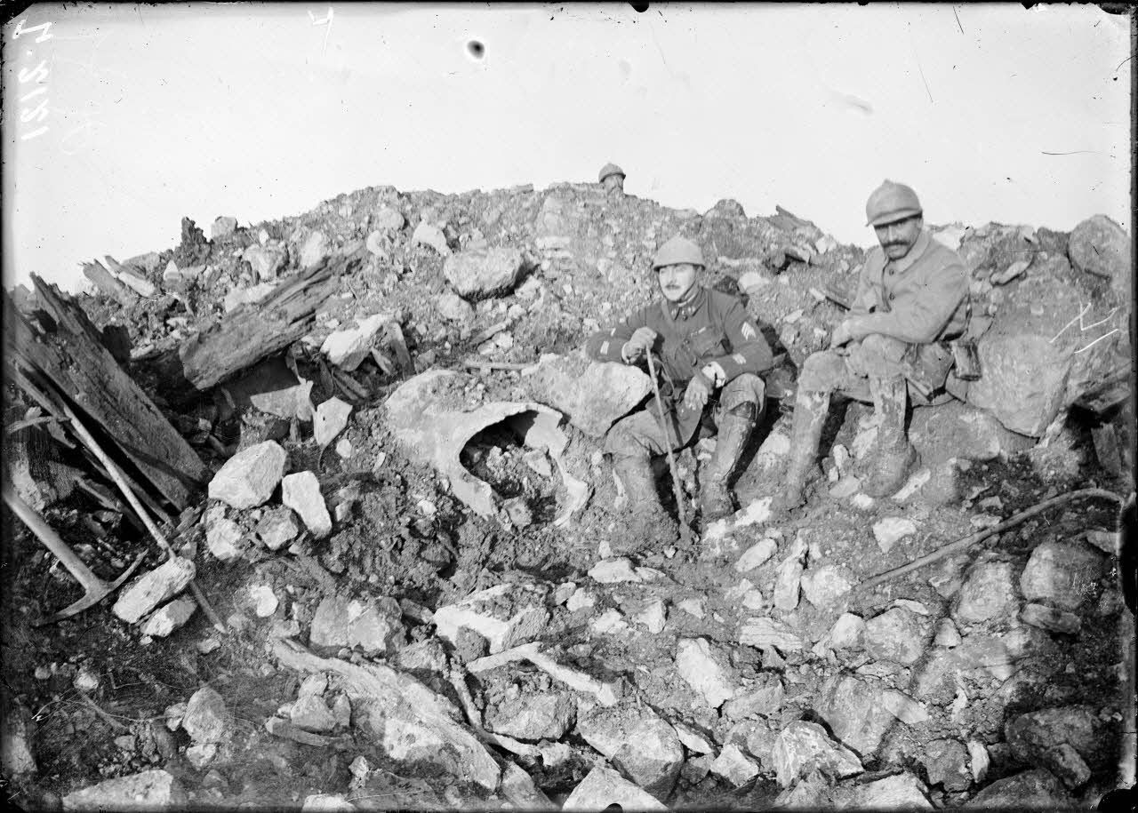 - à Douaumont, dans les ruines de l'église, le capitaine Le Bris (commandant le fort de Douaumont) et un opérateur de la SPA (Section Photographique des Armées), probablement Samama-Chikli, SPA 42 L 2121 ;