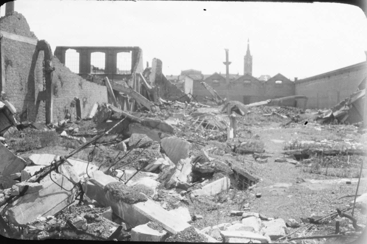 Débris gisant au sol dans un village détruit. On aperçoit au loin le clocher d'une église.
