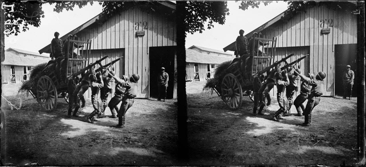 - au camp de Mourmelon : une sentinelle, un groupe d'infirmiers, la cuisine de campagne et ses hommes, des soldats occupés à nettoyer leurs bottes ;