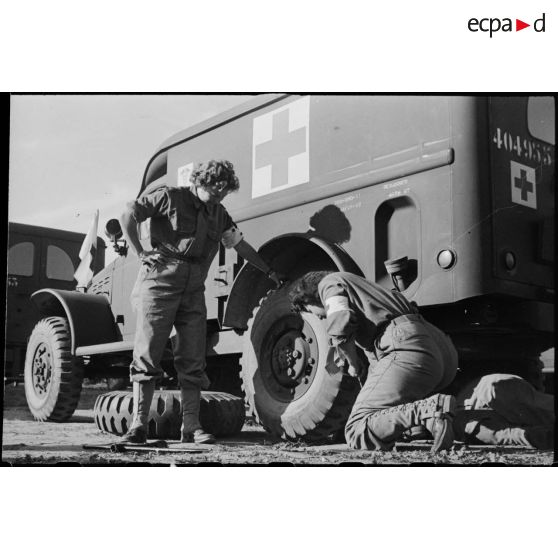 Changement d'une roue d'ambulance Dodge T215 par deux volontaires féminines conductrices à la 521e compagnie sanitaire.