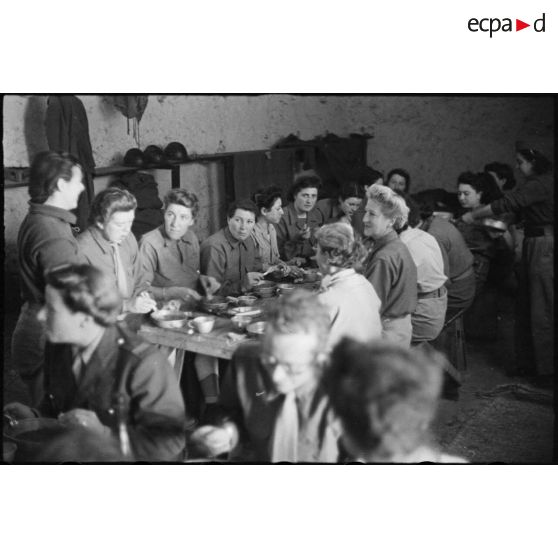 Des volontaires féminines conductrices à la 521e compagnie sanitaire déjeunent.
