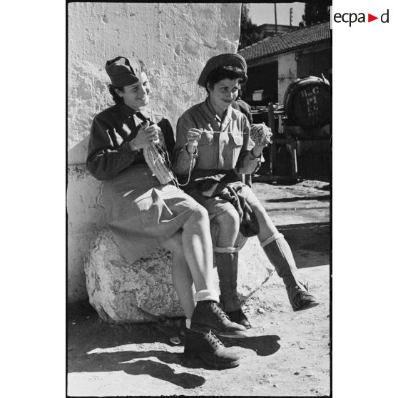 Assises sur un rocher, deux volontaires féminines conductrices à la 521e compagnie sanitaire tricotent.