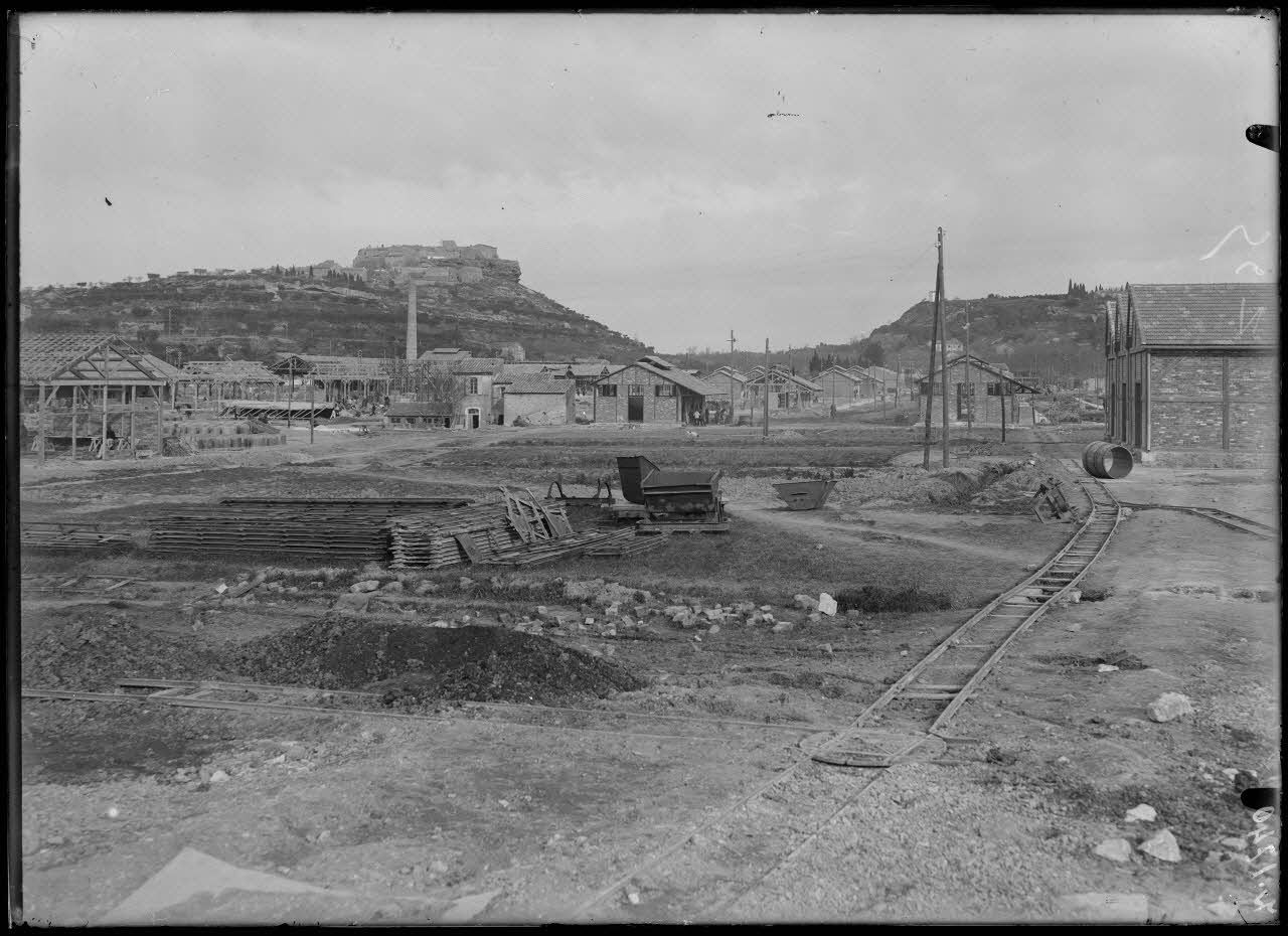 Saint-Chamas. Poudrerie. Nouvelle usine en construction en haut le vieux Miramas. [légende d’origine]