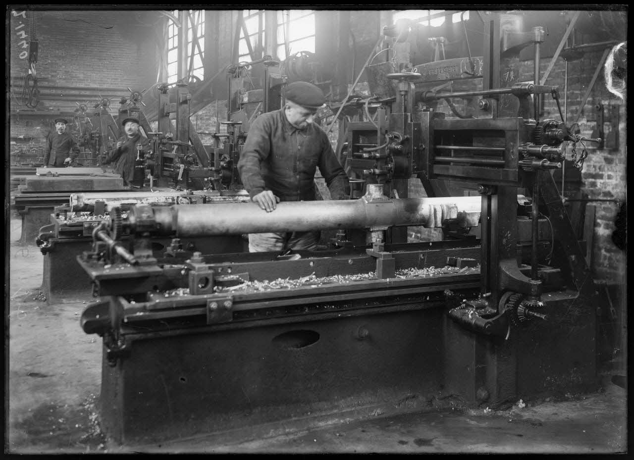 Forges de la Chaléassière (Saint-Etienne). Fabrique de bombes de 58 mm. Finissage de la calotte.