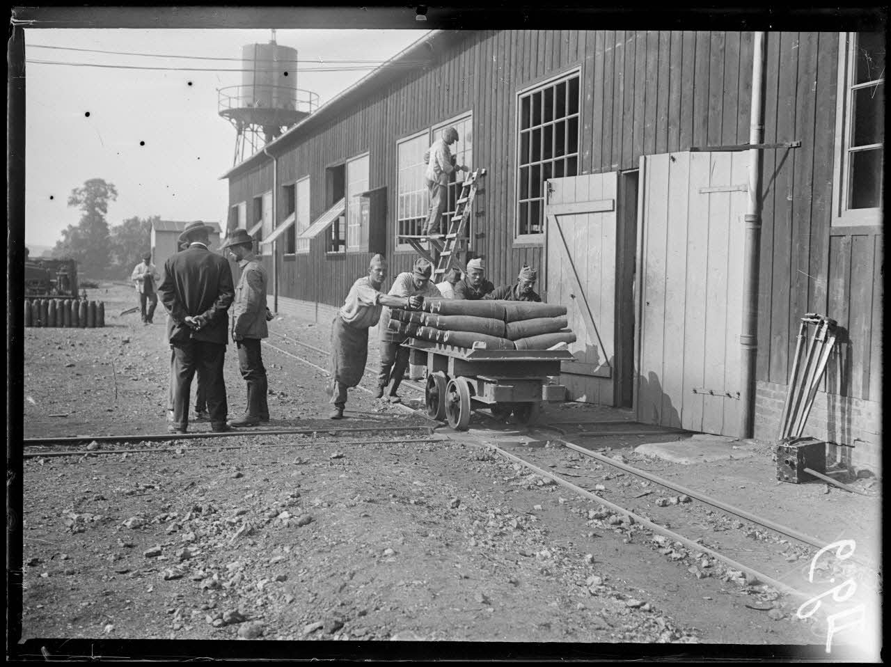 Une délégation portugaise visite le site où travaillent notamment des ouvriers portugais qui participent à l'effort de guerre en fabriquant des obus de 155 mm. Les obus sont acheminés vers les wagons en partance pour les dépôts de munitions.