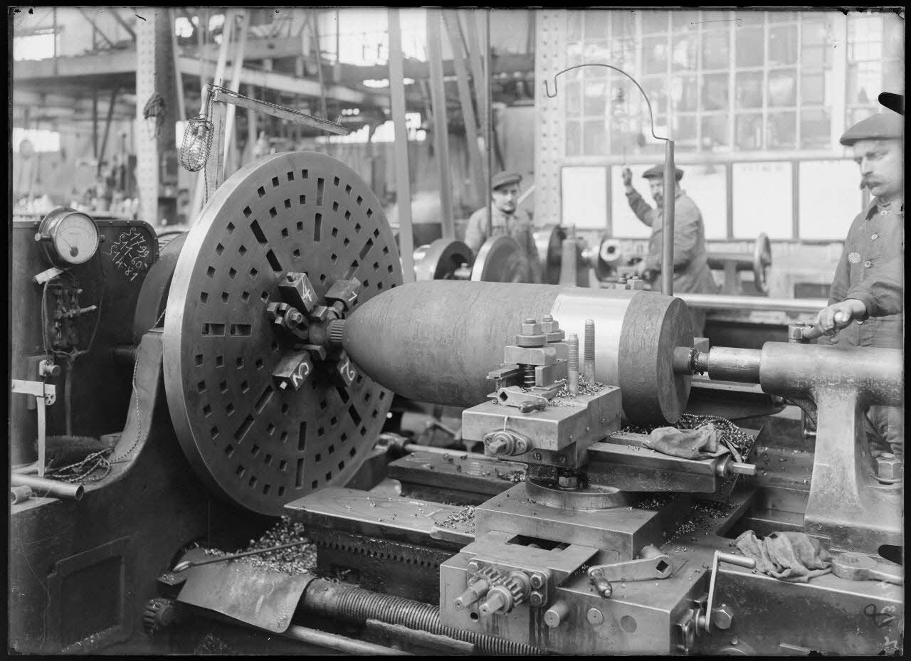 Forges de la Chaléassière (Saint-Etienne). Fabrique de bombes de 58 mm. Finissage de la calotte.