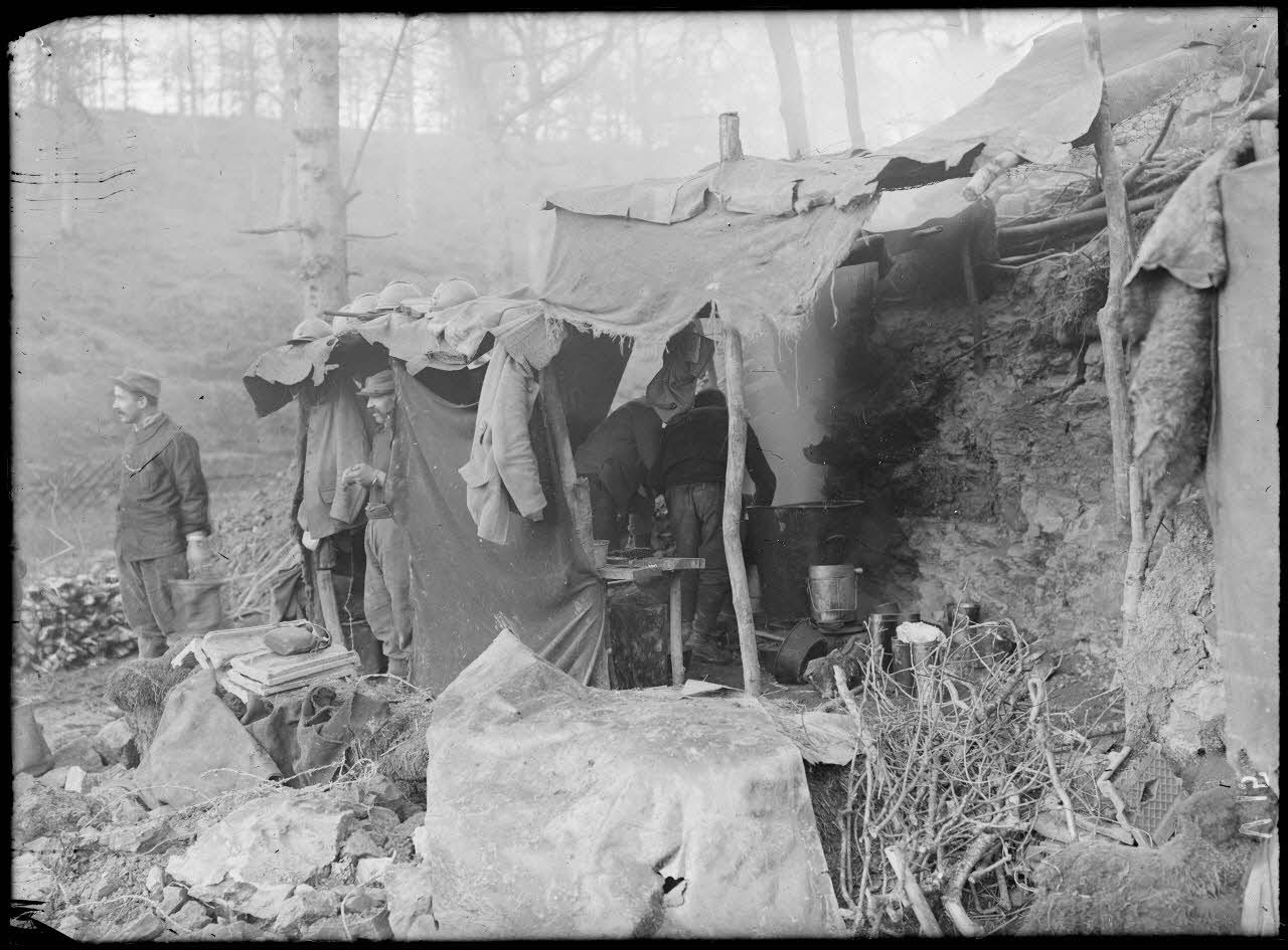 - Á Saint-Hubert, (forêt d'Argonne, 26-28/11/1915, de V13 V15), une compagnie d'infanterie tient les abris du ravin, préparant le repas dans une cuisine de fortune.
