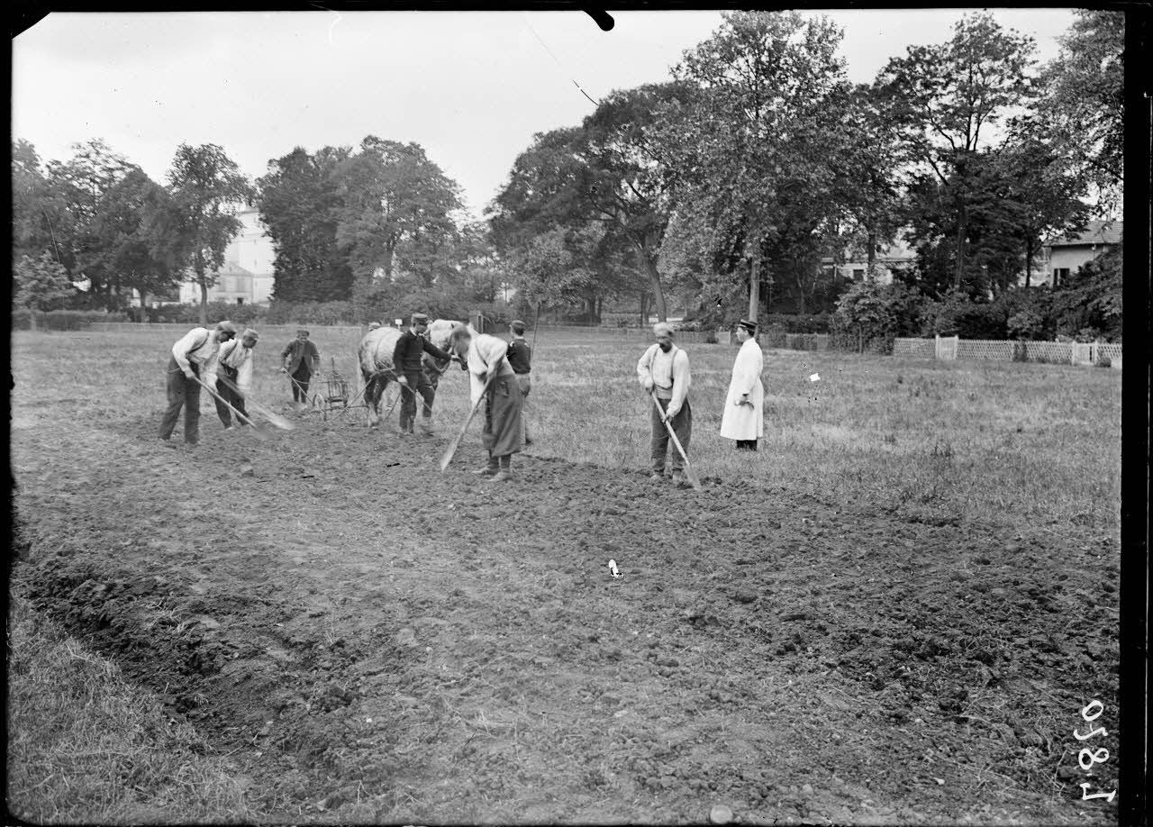 Saint-Maurice (Seine). Hôpital militaire n°5 bis. Convalescents de l'hôpital exécutant des travaux de labour. [légende d'origine]