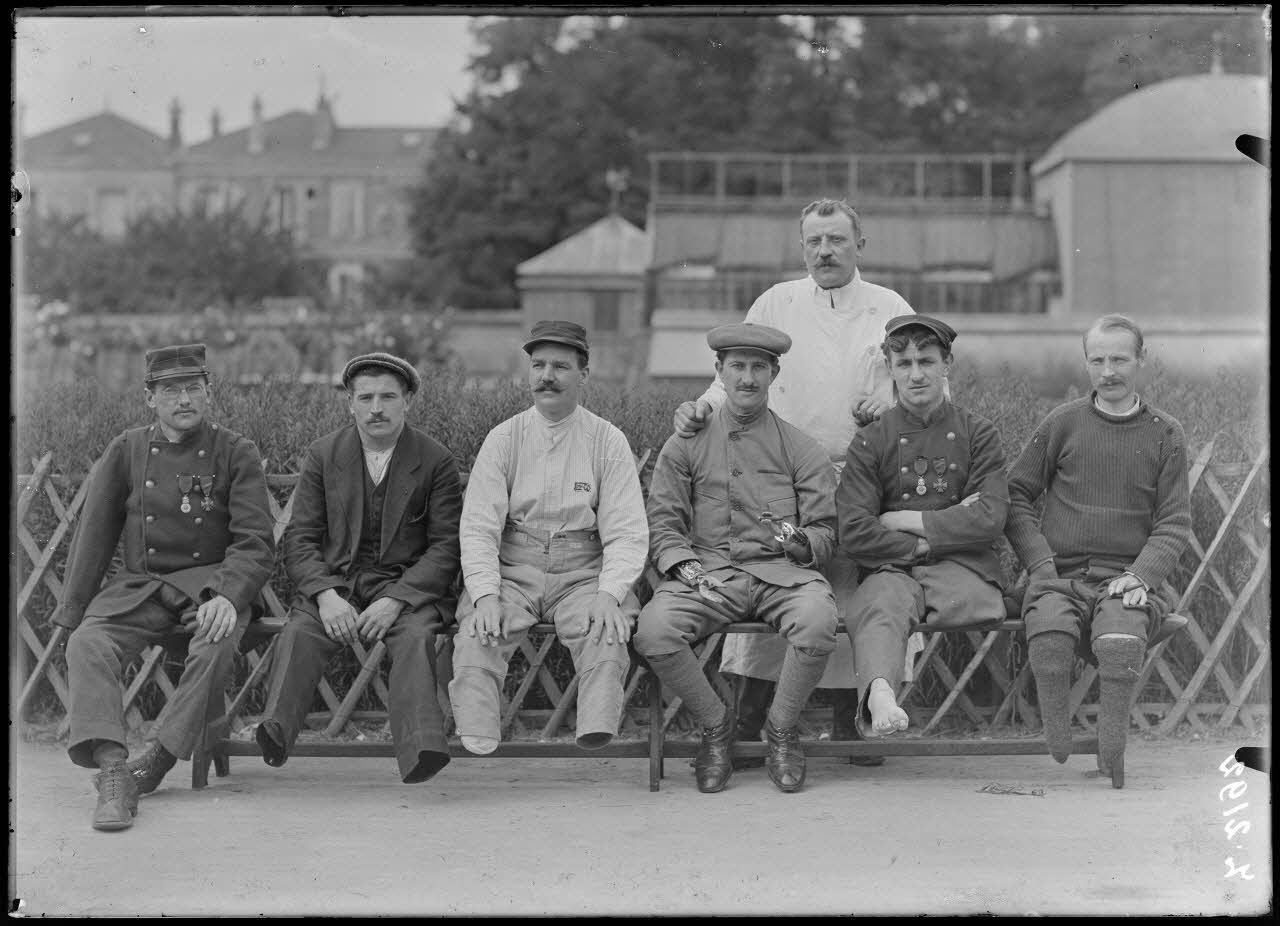 Saint-Maurice (Seine). Hôpital militaire n°5bis. Groupe d'amputés dans le jardin de l'hôpital. [légende d'origine]