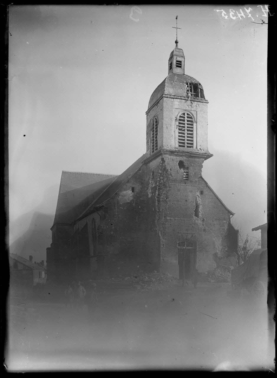 - A Challerange (au sud de Vouziers), un réseau de fils de fer barbelés recouvre le parvis de l'église en ruines. La gare est détruite.