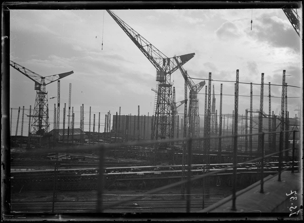 Saint-Nazaire, chantiers de l'Atlantique. Vue d'ensemble des cales de fabrication et ateliers. [légende d'origine]