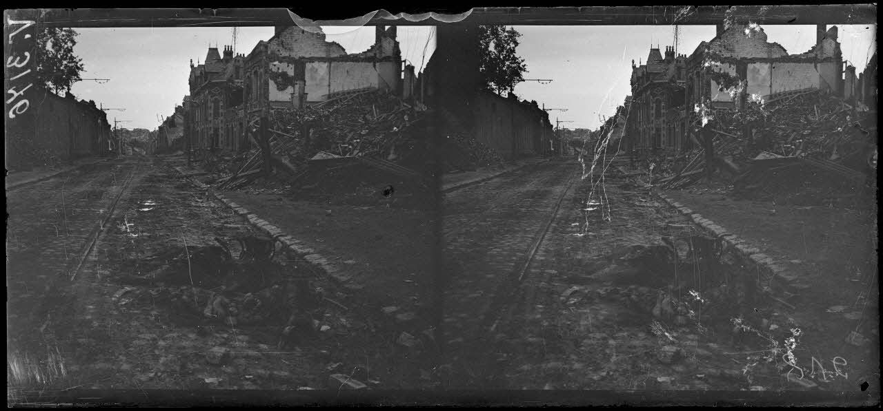 - Dans la ville de Saint-Quentin (Aisne, du 2 au 5 octobre 1918, V3163 à V 3202), les églises Saint-Martin et Sainte-Catherine, l'hôtel de ville, le théâtre, les halles et le palais de justice, ont été dévastés par les bombardements. Place Henri IV et rue de Paris, les maisons en ruines dominent le paysage, au même titre que les infrastructures industrielles (37 rue des Patriotes, la société de textile "Léon" et l'usine Beaurain du 23 boulevard Victor Hugo).