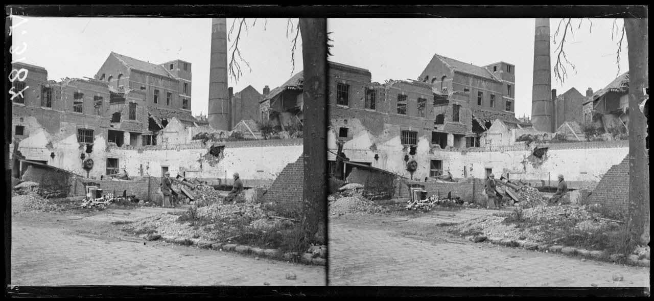 - Dans la ville de Saint-Quentin (Aisne, du 2 au 5 octobre 1918, V3163 à V 3202), les églises Saint-Martin et Sainte-Catherine, l'hôtel de ville, le théâtre, les halles et le palais de justice, ont été dévastés par les bombardements. Place Henri IV et rue de Paris, les maisons en ruines dominent le paysage, au même titre que les infrastructures industrielles (37 rue des Patriotes, la société de textile "Léon" et l'usine Beaurain du 23 boulevard Victor Hugo).