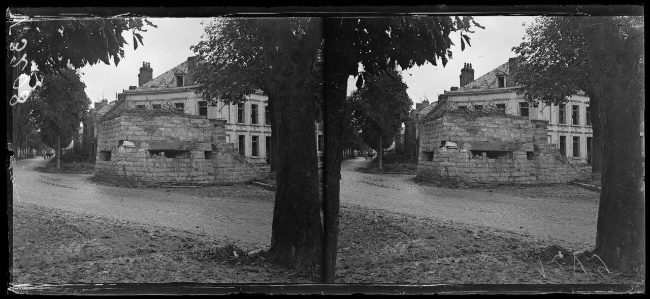 Saint-Quentin, visite de M. Clemenceau. Place de Longueville, blockhaus allemand pour mitrailleuse couvrant le carrefour et les rues. [légende d'origine]