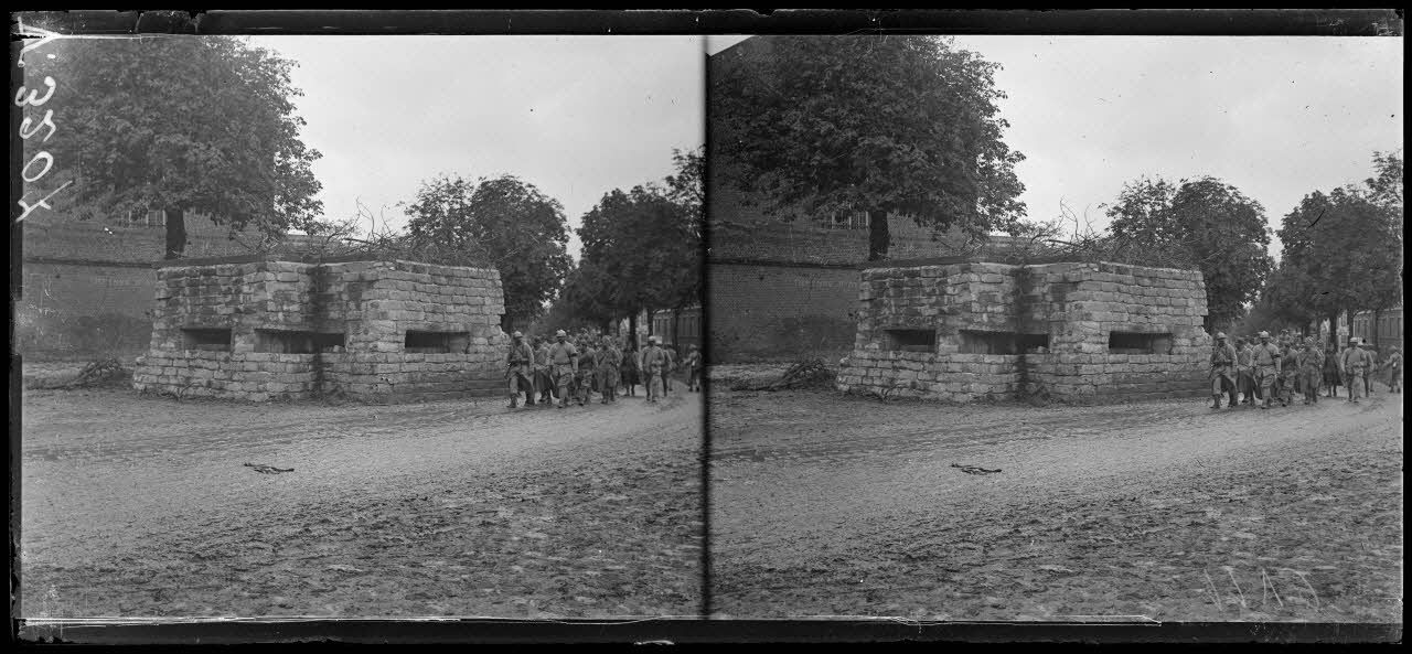 Saint-Quentin, visite de M. Clemenceau. Place de Longueville, blockhaus allemand pour mitrailleuse couvrant le carrefour et les rues. [légende d'origine]