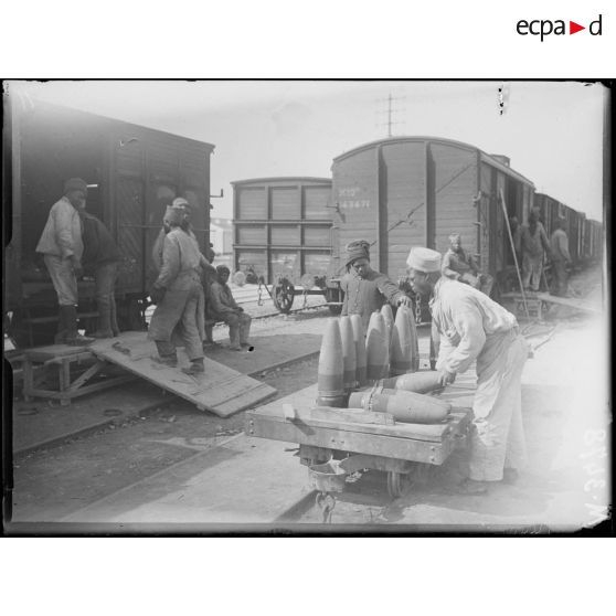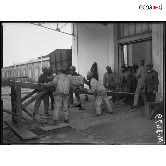 Toulon, arrivée à la Pyrotechnie de Milhaud, sénégalais transportant des obus.