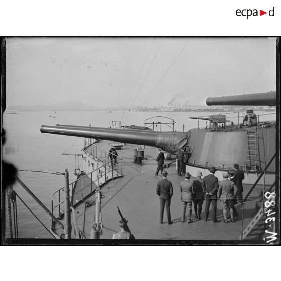 - Sur le cuirassé " Provence ", le groupe de journalistes américains visitent le bâtiment de guerre. Les canons de 340 mm qui équipent le navire pointent vers le ciel. Le " pacha " du navire accueille les journalistes dans le salon ;